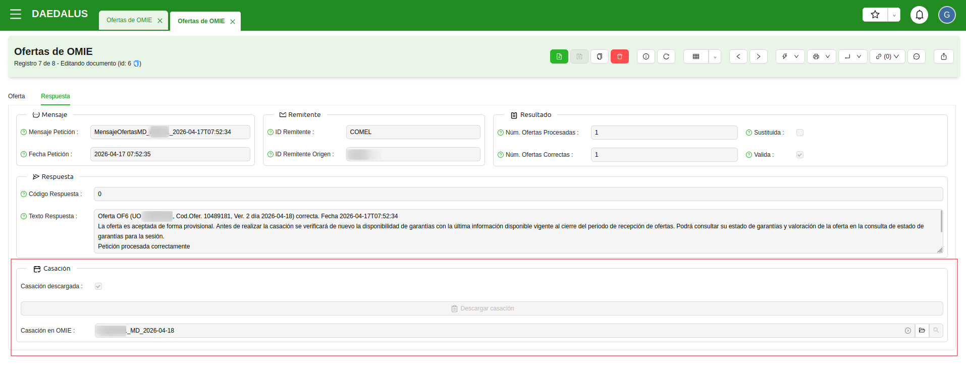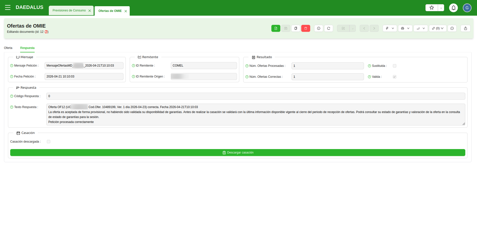 Para hacerlo, tan solo hay que hacer clic en el botón Descargar casación, en la pestaña Respuesta. Una vez descargada, la casación queda registrada en el ERP y se puede consultar directamente desde su oferta de OMIE correspondiente.