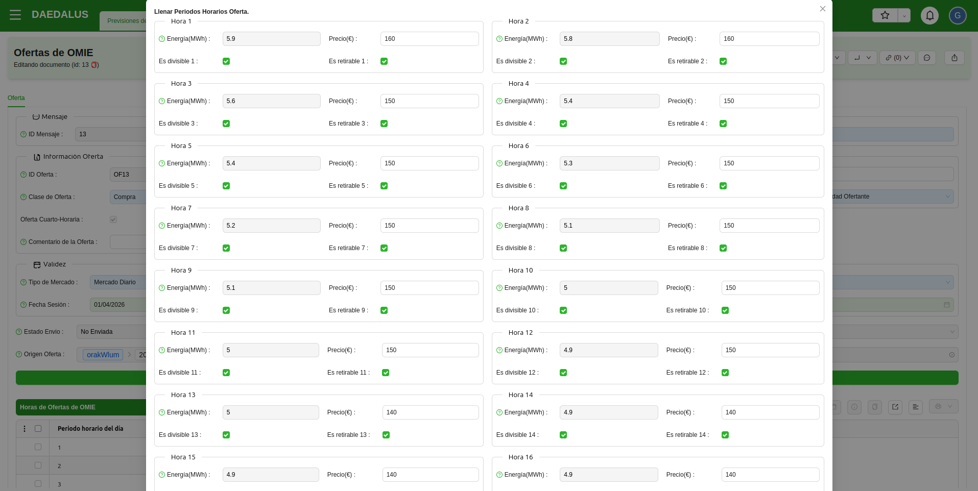 Si se quieren modificar los valores de energía y/o los precios de las ofertas, se puede hacer con el asistente Llenar Horas Oferta, que mostrará los valores tal como figuran en la oferta y permitirá modificarlos.