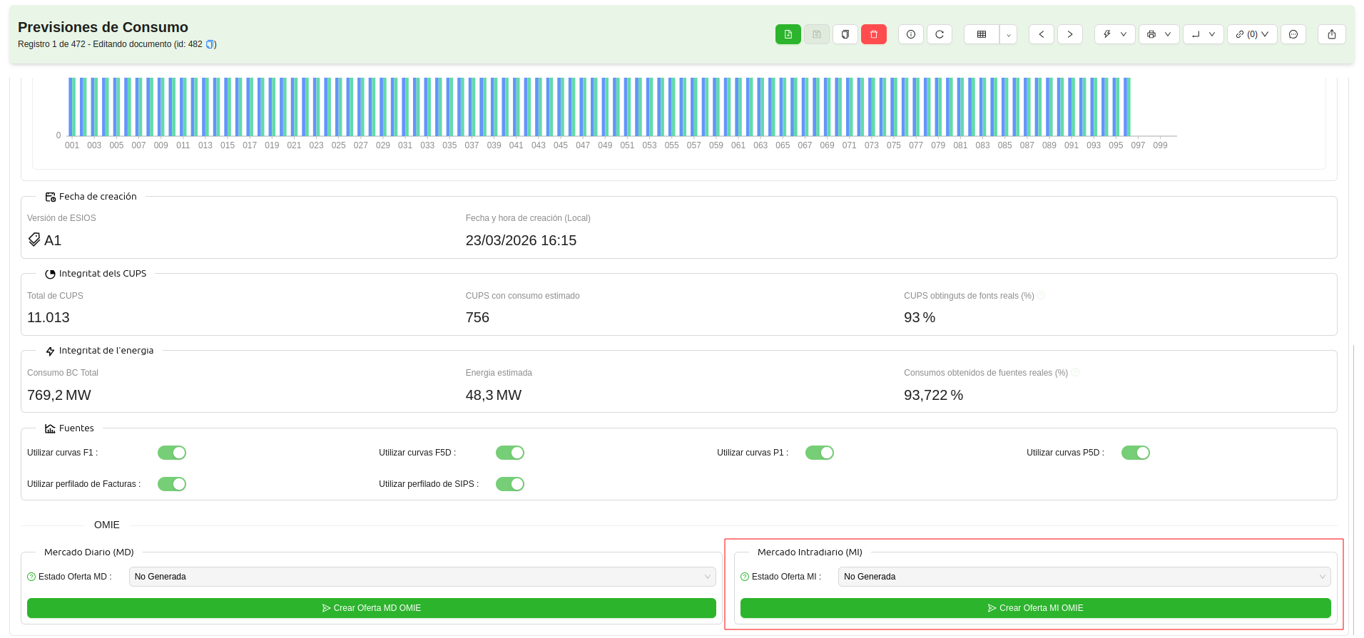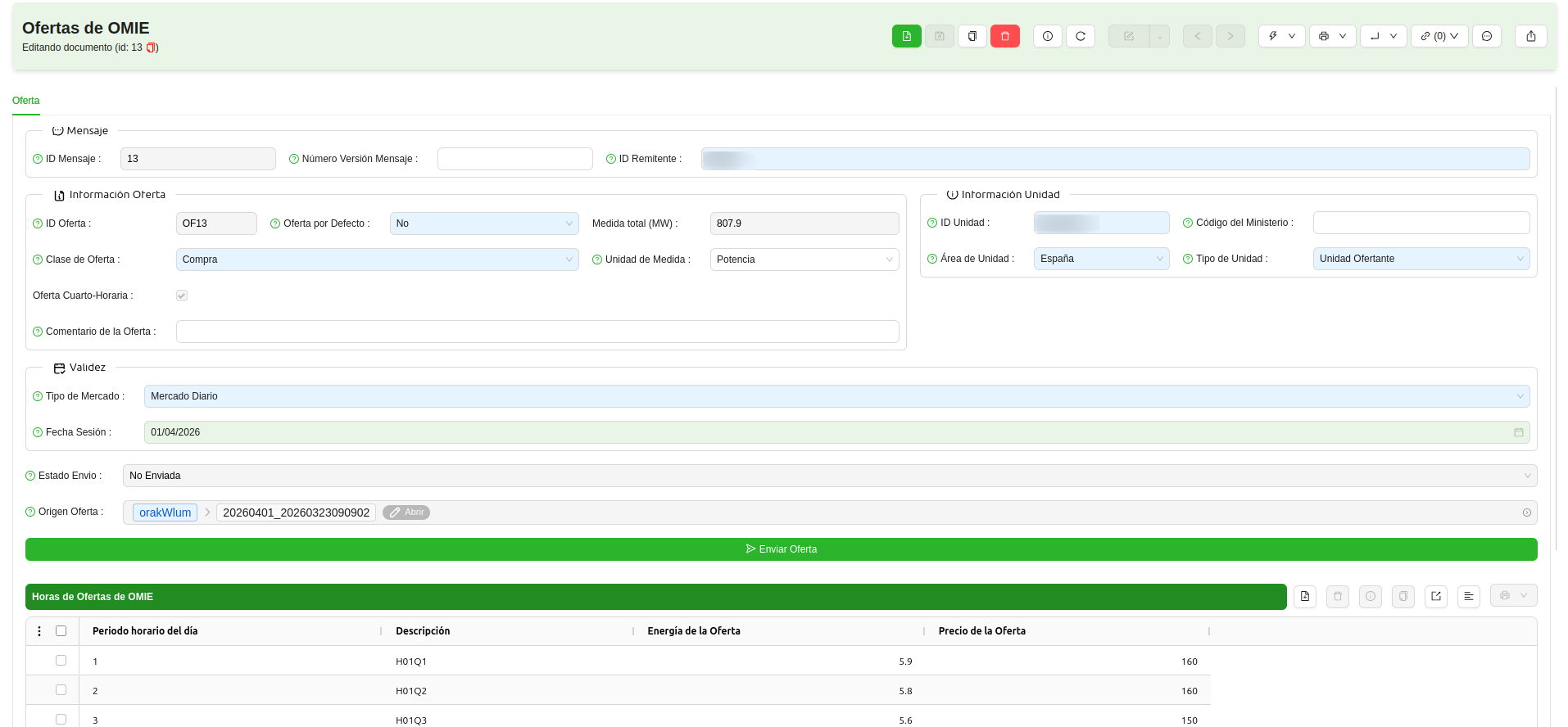 - Ofertas de OMIE: Desde este listado se pueden ver todas las ofertas generadas, tanto para el MD como para el MI.