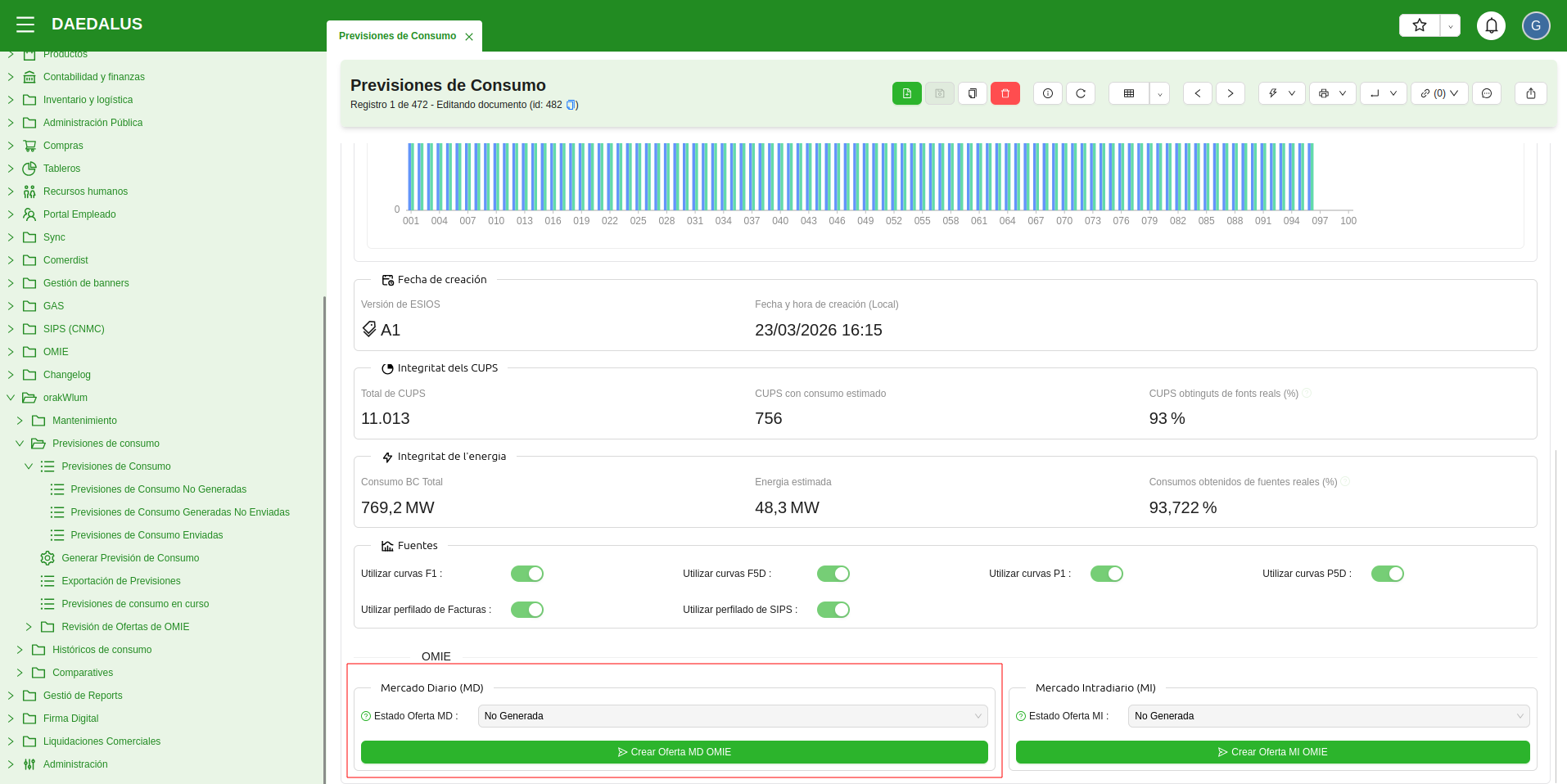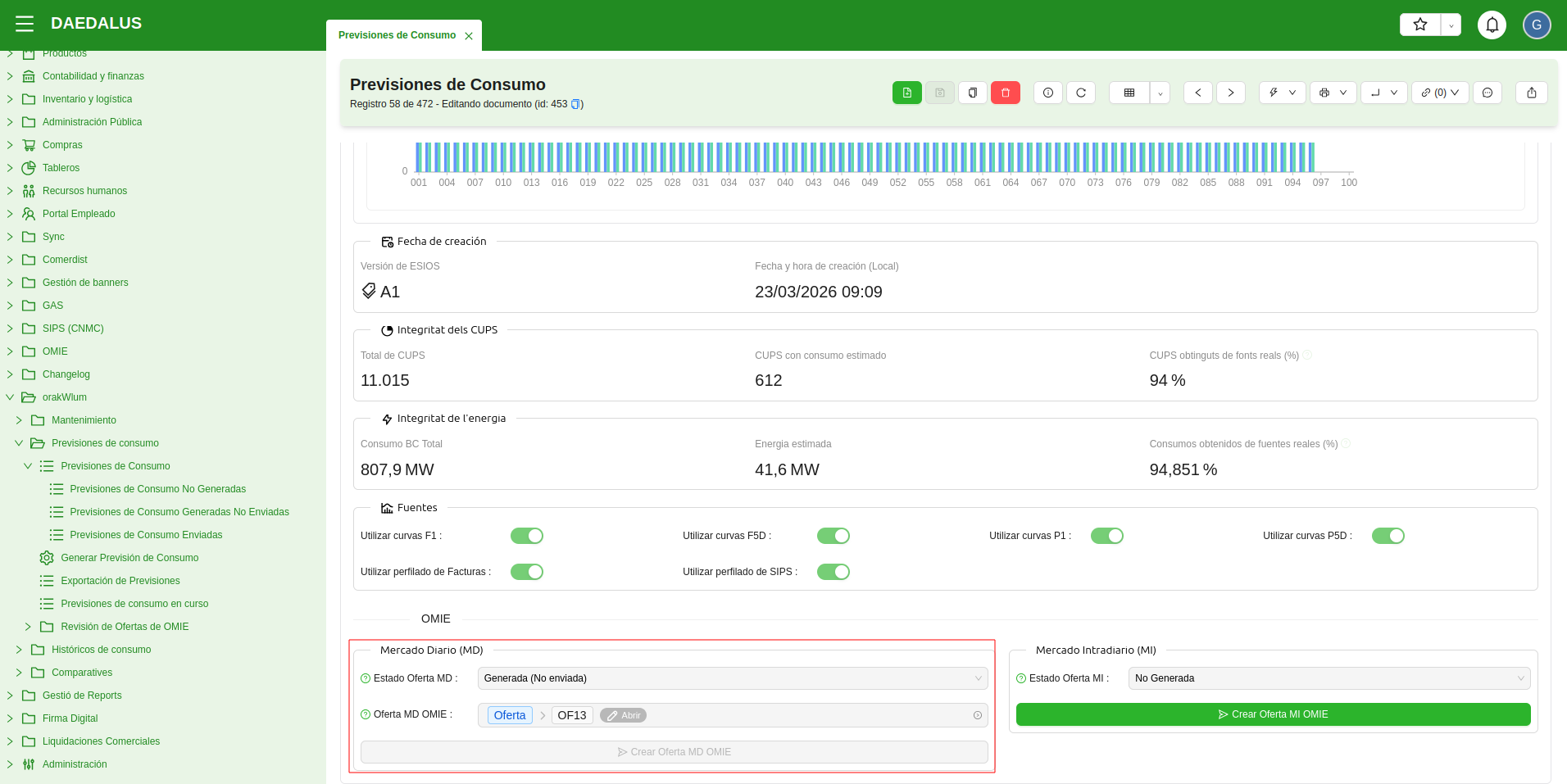 En el ERP de Comercializadora se puede configurar y programar un automatismo que diariamente genera una previsión de consumo de orakWlum para el día siguiente (día D+1) y la publica en el Mercado Diario de OMIE.